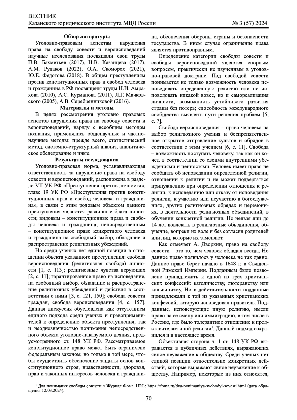 8. Шинин Д.В. Уголовная и административная ответственность за нарушение права на свободу совести и вероисповедания: проблемы разграничения // Журнал российского права. 2016. № 5 (233). С. 81-89.