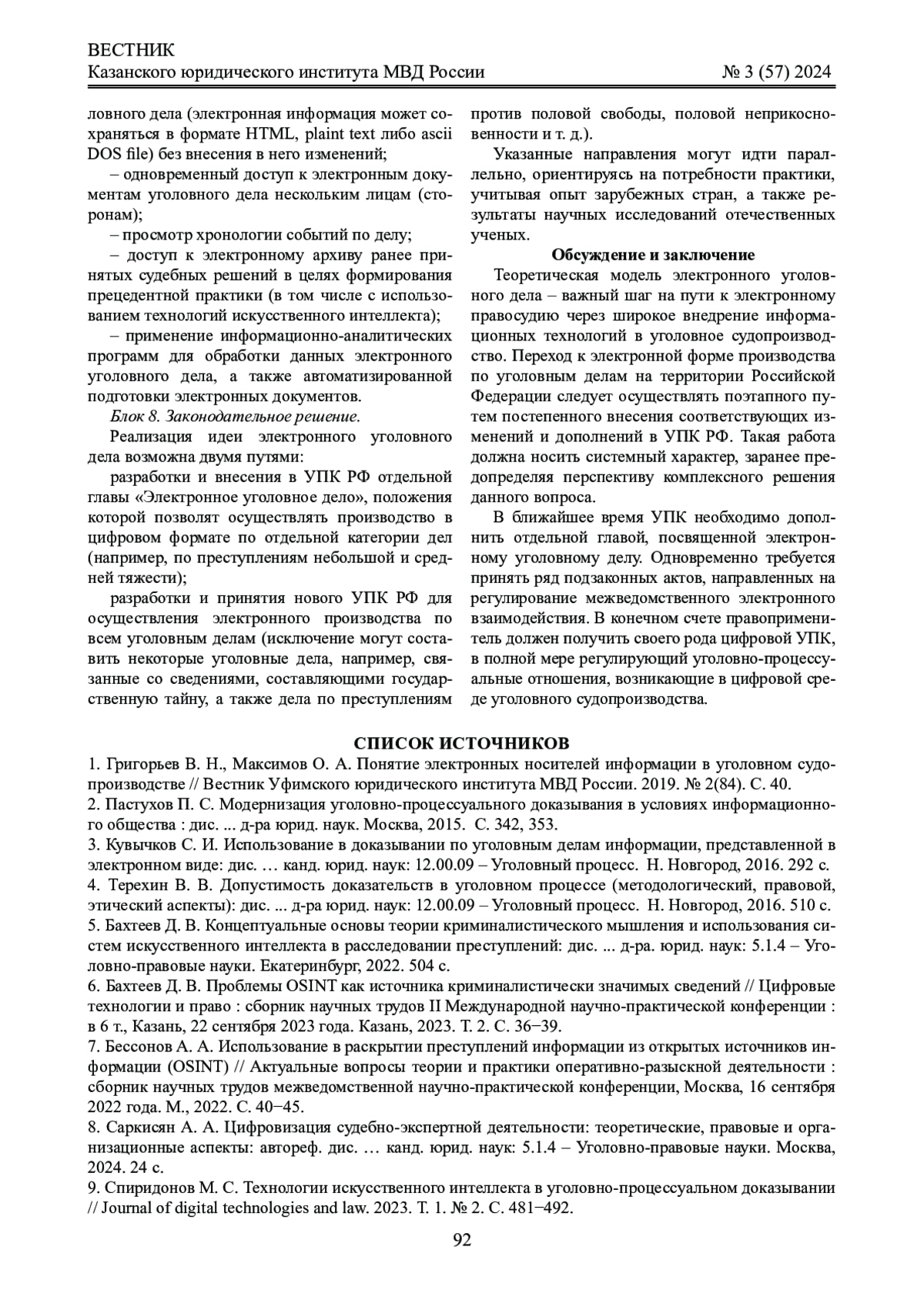 15. Федорович В. Ю., Химичева О. В., Андреев А. В. Внедрение технологий информатизации и искусственного интеллекта как перспективные направления развития современного уголовного судопроизводства // Вестник Московского университета МВД России. 2021. № 2. С. 205-210. EDN: YGAGAY