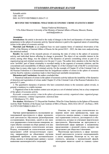 Результаты исследования: представлена модель исследовательского процесса оценки состояния преступности в сфере экономической деятельности и отдельных факторов, влияющих на её изменение. Объектом нашего научного интереса в статье, в том числе, послужил анализ динамики лиц, совершающих преступления в составе организованной группы и преступного сообщества, за последние 11 лет. Автором обращено внимание на то, что самая «невидимая» часть латентной преступности фиксируется преимущественно в сегменте экономических отношений, а скрытость и скрываемость преступлений, предусмотренных главой 22 УК РФ, в несколько раз выше, чем по многим другим видам преступной деятельности. На примере главы 22 УК РФ продемонстрировано, что фиксируемое статистикой незначительное число преступлений в сфере экономической деятельности иногда приводит к их необъективной и недостоверной интерпретации.