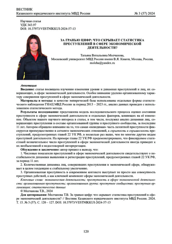 2. Молчанова Т.В. Трудности статистической интерпретации преступности // Вестник Казанского юридического института МВД России. 2023. T. 14. № 2 (52). С. 90-97. DOI: 10.37973/KUI.2023.27.17.013 EDN: NICXAK