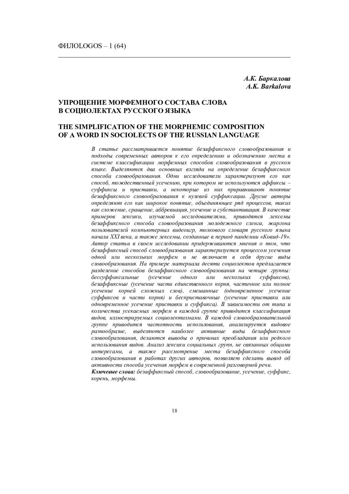 БАРКАЛОВА А.К. УПРОЩЕНИЕ МОРФЕМНОГО СОСТАВА СЛОВА В СОЦИОЛЕКТАХ РУССКОГО ЯЗЫКА // ФИЛОLOGOS. 2025. № 1 (64)