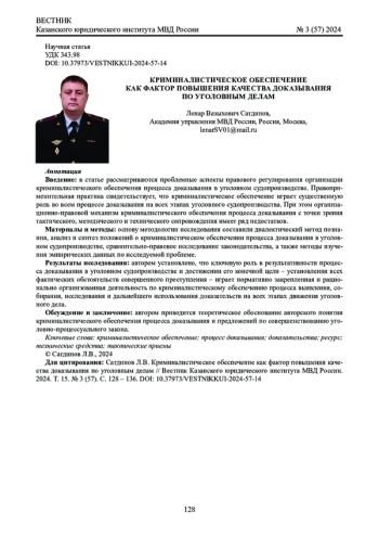 Материалы и методы: основу методологии исследования составили диалектический метод познания, анализ и синтез положений о криминалистическом обеспечении процесса доказывания в уголовном судопроизводстве, сравнительно-правовое исследование законодательства, а также методы изучения эмпирических данных по исследуемой проблеме.