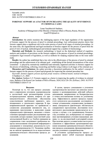 Обсуждение и заключение: автором приводится теоретическое обоснование авторского понятия криминалистического обеспечения процесса доказывания и предложений по совершенствованию уголовно-процессуального закона.