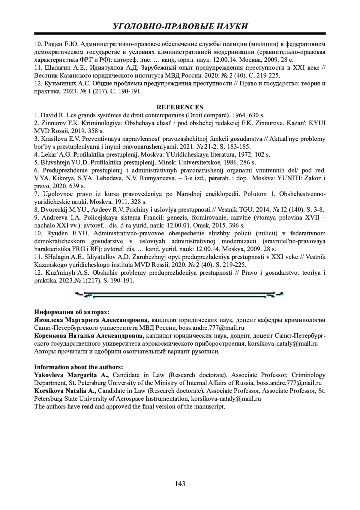 11. Шалагин А.Е., Идиятуллов А.Д. Зарубежный опыт предупреждения преступности в XXI веке // Вестник Казанского юридического института МВД России. 2020. № 2 (40). С. 219-225. EDN: KWRFMW
