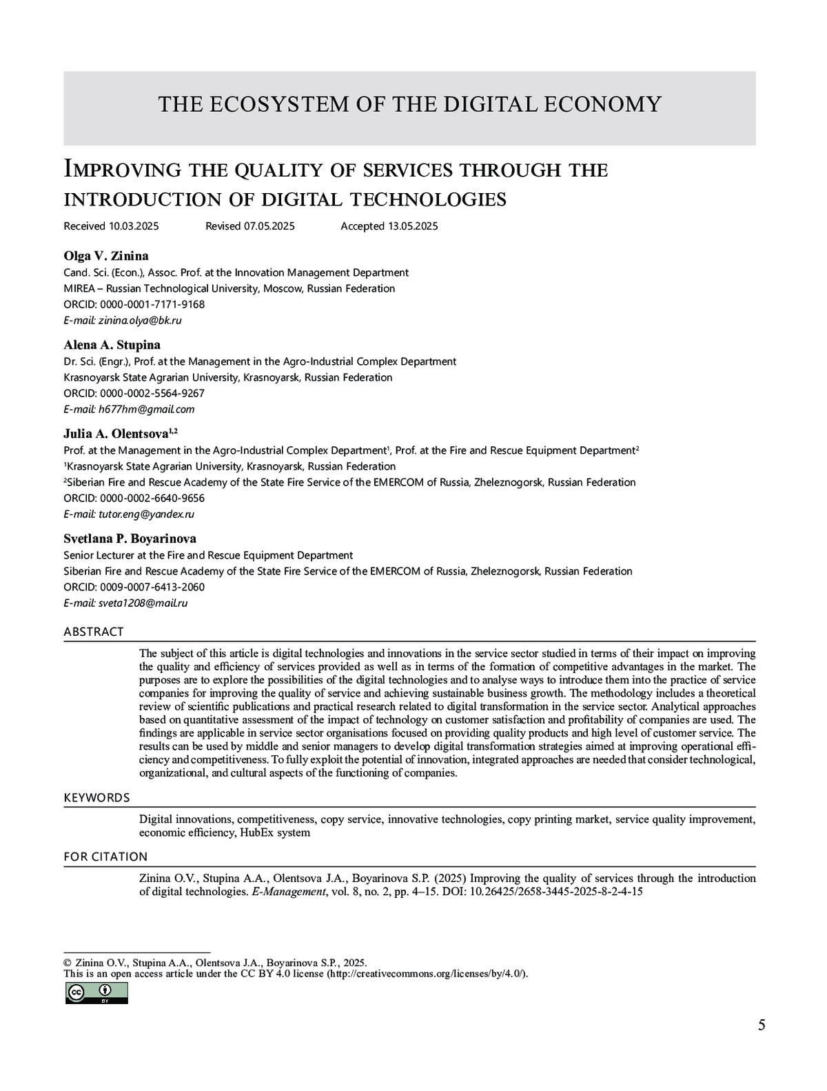 Предметом данной статьи выступают цифровые технологии и инновации в сфере услуг, исследуемые с точки зрения их воздействия на повышение качества и эффективности предоставляемых услуг, а также формирования конкурентных преимуществ на рынке. Цель состоит в изучении возможностей цифровых технологий и анализе путей их внедрения в практику сервисных компаний для улучшения качества обслуживания и достижения устойчивого роста бизнеса. Методология включает теоретический обзор научных публикаций и практических исследований, касающихся цифровой трансформации в секторе услуг. Используются аналитические подходы, основанные на количественной оценке влияния технологий на показатели удовлетворенности клиентов и прибыльность компаний. Полученные выводы применимы в организациях сферы услуг, ориентированных на предоставление качественных продуктов и высокий уровень клиентского сервиса. Результаты могут использоваться менеджерами среднего и высшего звена для разработки стратегий цифрового преобразования, направленных на повышение операционной эффективности и конкурентоспособности. Для полноценного освоения потенциала инноваций необходимы комплексные подходы, учитывающие технологические, организационные и культурные аспекты функционирования компаний.
