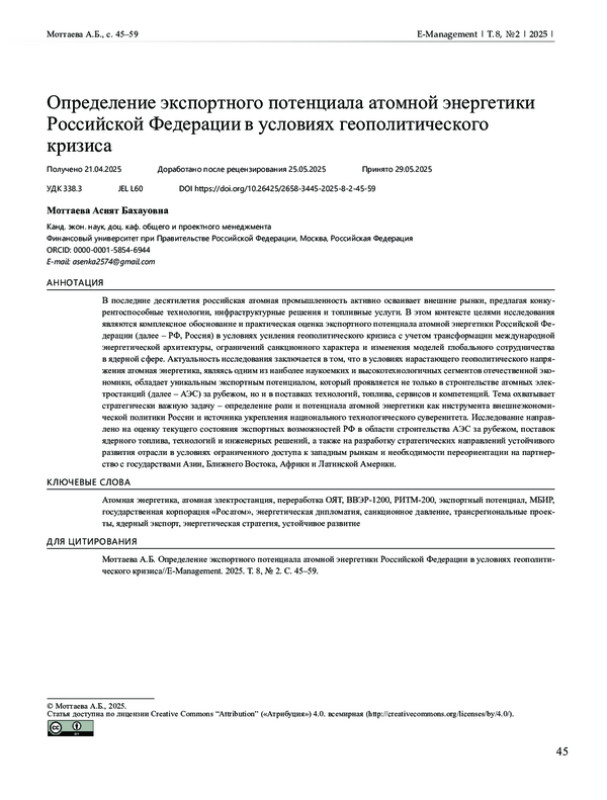 В последние десятилетия российская атомная промышленность активно осваивает внешние рынки, предлагая конкурентоспособные технологии, инфраструктурные решения и топливные услуги. В этом контексте целями исследования являются комплексное обоснование и практическая оценка экспортного потенциала атомной энергетики Российской Федерации (далее – РФ, Россия) в условиях усиления геополитического кризиса с учетом трансформации международной энергетической архитектуры, ограничений санкционного характера и изменения моделей глобального сотрудничества в ядерной сфере. Актуальность исследования заключается в том, что в условиях нарастающего геополитического напряжения атомная энергетика, являясь одним из наиболее наукоемких и высокотехнологичных сегментов отечественной экономики, обладает уникальным экспортным потенциалом, который проявляется не только в строительстве атомных электростанций (далее – АЭС) за рубежом, но и в поставках технологий, топлива, сервисов и компетенций. Тема охватывает стратегически важную задачу – определение роли и потенциала атомной энергетики как инструмента внешнеэкономической политики России и источника укрепления национального технологического суверенитета. Исследование направлено на оценку текущего состояния экспортных возможностей РФ в области строительства АЭС за рубежом, поставок ядерного топлива, технологий и инженерных решений, а также на разработку стратегических направлений устойчивого развития отрасли в условиях ограниченного доступа к западным рынкам и необходимости переориентации на партнерство с государствами Азии, Ближнего Востока, Африки и Латинской Америки.
