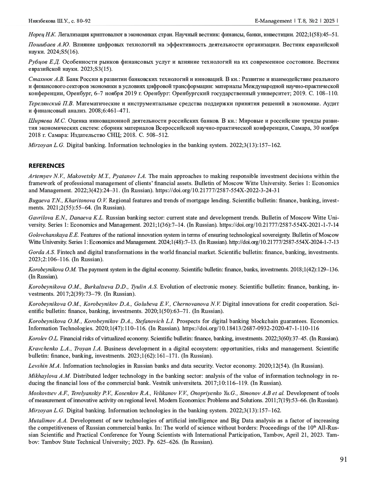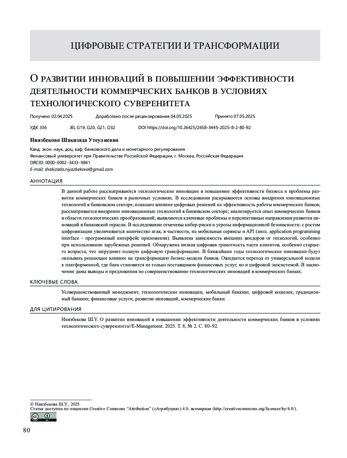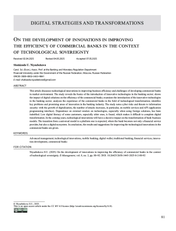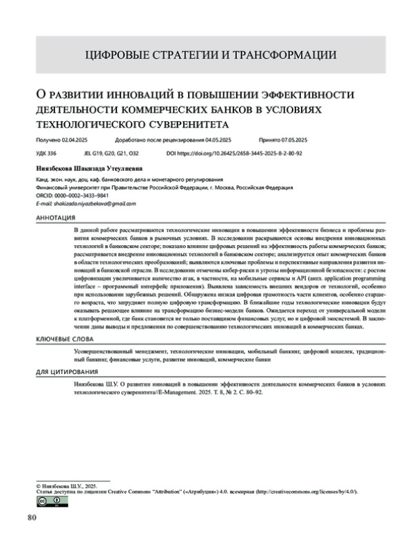 НИЯЗБЕКОВА Ш. У. О РАЗВИТИИ ИННОВАЦИЙ В ПОВЫШЕНИИ ЭФФЕКТИВНОСТИ ДЕЯТЕЛЬНОСТИ КОММЕРЧЕСКИХ БАНКОВ В УСЛОВИЯХ ТЕХНОЛОГИЧЕСКОГО СУВЕРЕНИТЕТА // E-MANAGEMENT. 2025. Т. 8 № 2