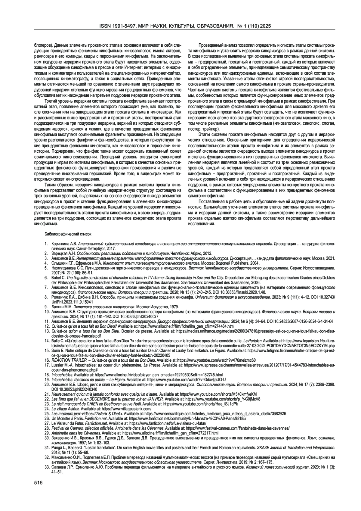 11. Анисимов В.Е. Внешняя иерархия французского кинодискурса. Дискурс профессиональной коммуникации. 2024; № 6 (4): 34-64. DOI: 10.24833/2687-0126-2024-6-4-34-64 EDN: BMPNXA