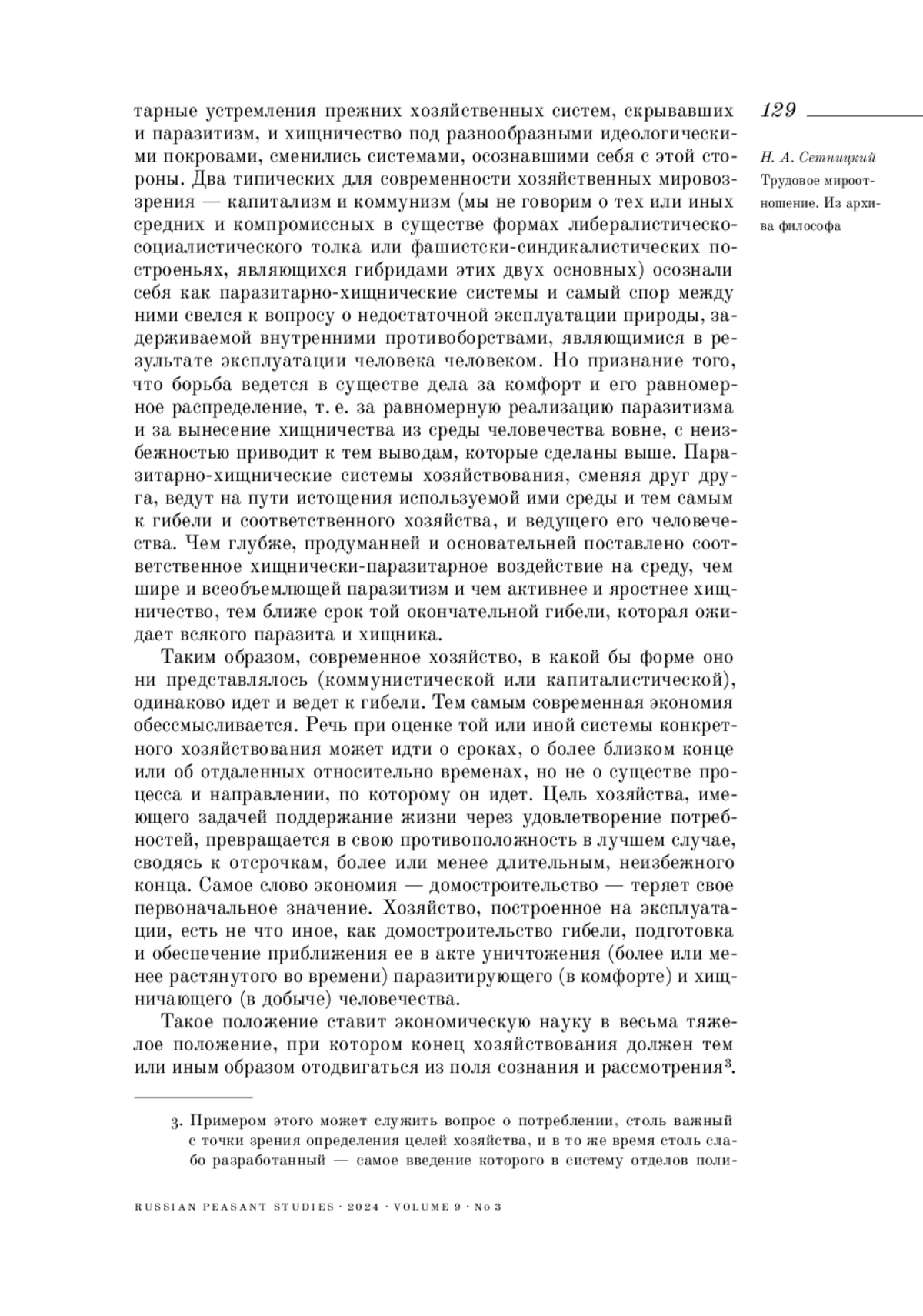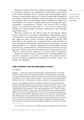 В настоящую публикацию включены архивные статьи и заметки Николая Александровича Сетницкого (1888-1937), философа, экономиста, статистика, одного их ведущих представителей той линии ноосферной, космической мысли 1920-1930-х гг., которая связана с продолжением и творческим развитием идей Н. Ф. Федорова. Публикуемые материалы относятся к 1923-1924 гг., когда Сетницкий жил и работал в Москве и совместно со своими друзьями-единомышленниками А. К. Горским и В. Н. Муравьевым занимался актуальной для первого пореволюционного десятилетия проблемой труда и научной организации труда. В отличие от теоретиков НОТ, мыслители-космисты федоровской ориентации трактовали труд как мироустроительную, космизующую и организующую деятельность человека в природе, направленную на преодоление хаоса, смерти, распада, как силу, противостоящую энтропии. Ряд публикуемых материалов предназначался для журнала «Октябрь мысли», с которым в 1924 г. активно сотрудничали Горский и Сетницкий. Размышления о цели труда соединялись с размышлениями о смысле культуры как благого возделывания и творческого преобразования мира. Статьи, связанные с проблемой трудового мироотношения, требующего активности человека в природе и противостоящего в этом смысле пассивно-потребительскому отношению к земле, выводили к выдвинувшейся в центр внимания для Сетницкого теме «Эксплуатация или регуляция?», разработку которой он вел в специальной статье. В подтексте статей, предназначавшихся для советской аудитории, был практически нивелирован религиозно-философский план трактовки понятий регуляции, труда и культуры, возводившихся Сетницким к исполнению заповеди «обладания землей», к эсхатологическому пересозданию мира, но некоторые словесные и смысловые обороты намекали на источную активно-христианскую направленность мысли философа. Публикуемые тексты хранятся в составе харбинского архива Н. А. Сетницкого в собрании Fеdoroviana Pragensia Литературного архива Музея национальной письменности (Чешская Республика). Ф. 341.
