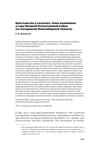 В статье анализируется социальное и экономическое поведение колхозного крестьянства в годы Великой Отечественной войны. В условиях усиления мобилизационного натиска императив выживания по-прежнему определял крестьянское отношение к труду, хозяйствованию, своему ближайшему окружению и вышестоящей власти. Положение колхозов было дифференцированным: их экономика зависела от степени обеспеченности облагаемых натуральными налогами земельных площадей рабочей силой. Отсюда существенные различия в условиях хозяйственной деятельности. В соответствии с этим варьировалось отношение крестьянства к колхозному труду. В наименее благоприятных обстоятельствах участие в артельных работах не сулило крестьянину ничего, кроме сверхинтенсивного труда без достаточной для выживания компенсации. Хотя в целом поведение крестьян можно считать адаптивным, невыносимые условия в экономически бесперспективных колхозах вынуждали их прибегать к практикам пассивного сопротивления (от некачественного и несвоевременного выполнения работ до прямых противозаконных действий). Границы терпимости по отношению к крестьянскому неповиновению на протяжении 1930-1940-х годов не были стабильными, однако сужению пределов дозволенного в условиях войны мешало слабое надзорное присутствие власти в сельской местности. В самой же крестьянской среде противозаконные действия получали моральное оправдание и зачастую помогали защитить себя от угрозы голода. Упорство, с которым крестьянство нарушало границы законности, значительно сокращало возможности власти контролировать колхозную экономику.