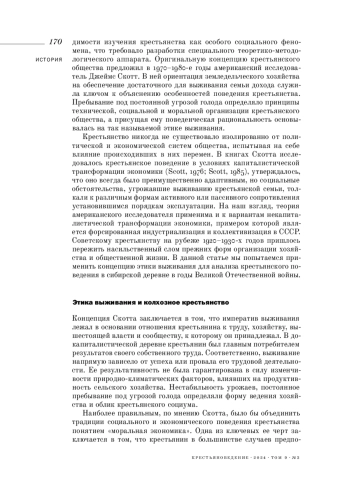 В 1960‒1970-е годы крестьяноведение обозначило себя в качестве альтернативы теоретическим подходам, отрицавшим самобытность крестьянства или предлагавшим рассматривать его в рамках уже существующих научных дисциплин. Оно настаивало на необходимости изучения крестьянства как особого социального феномена, что требовало разработки специального теоретико-методологического аппарата. Оригинальную концепцию крестьянского общества предложил в 1970‒1980-е годы американский исследователь Джеймс Скотт. В ней ориентация земледельческого хозяйства на обеспечение достаточного для выживания семьи дохода служила ключом к объяснению особенностей поведения крестьянства. Пребывание под постоянной угрозой голода определяло принципы технической, социальной и моральной организации крестьянского общества, а присущая ему поведенческая рациональность основывалась на так называемой этике выживания.