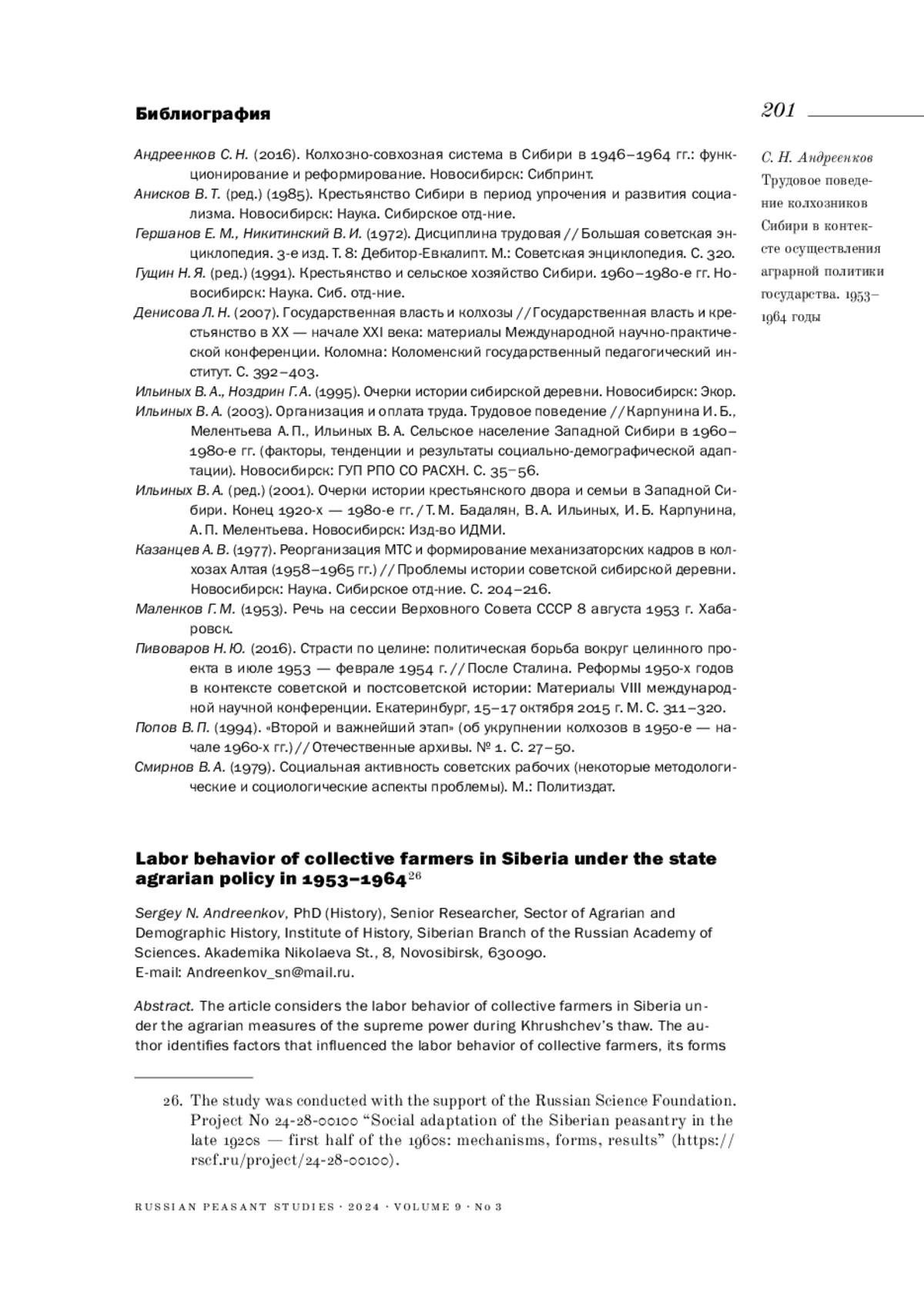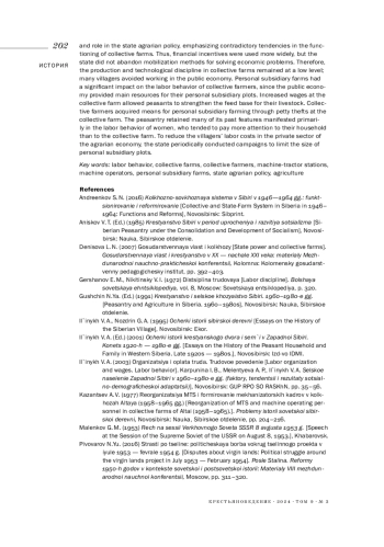 1. Андреенков С. Н. (2016). Колхозно-совхозная система в Сибири в 1946-1964 гг.: функционирование и реформирование. Новосибирск: Сибпринт. EDN: WWZGVX