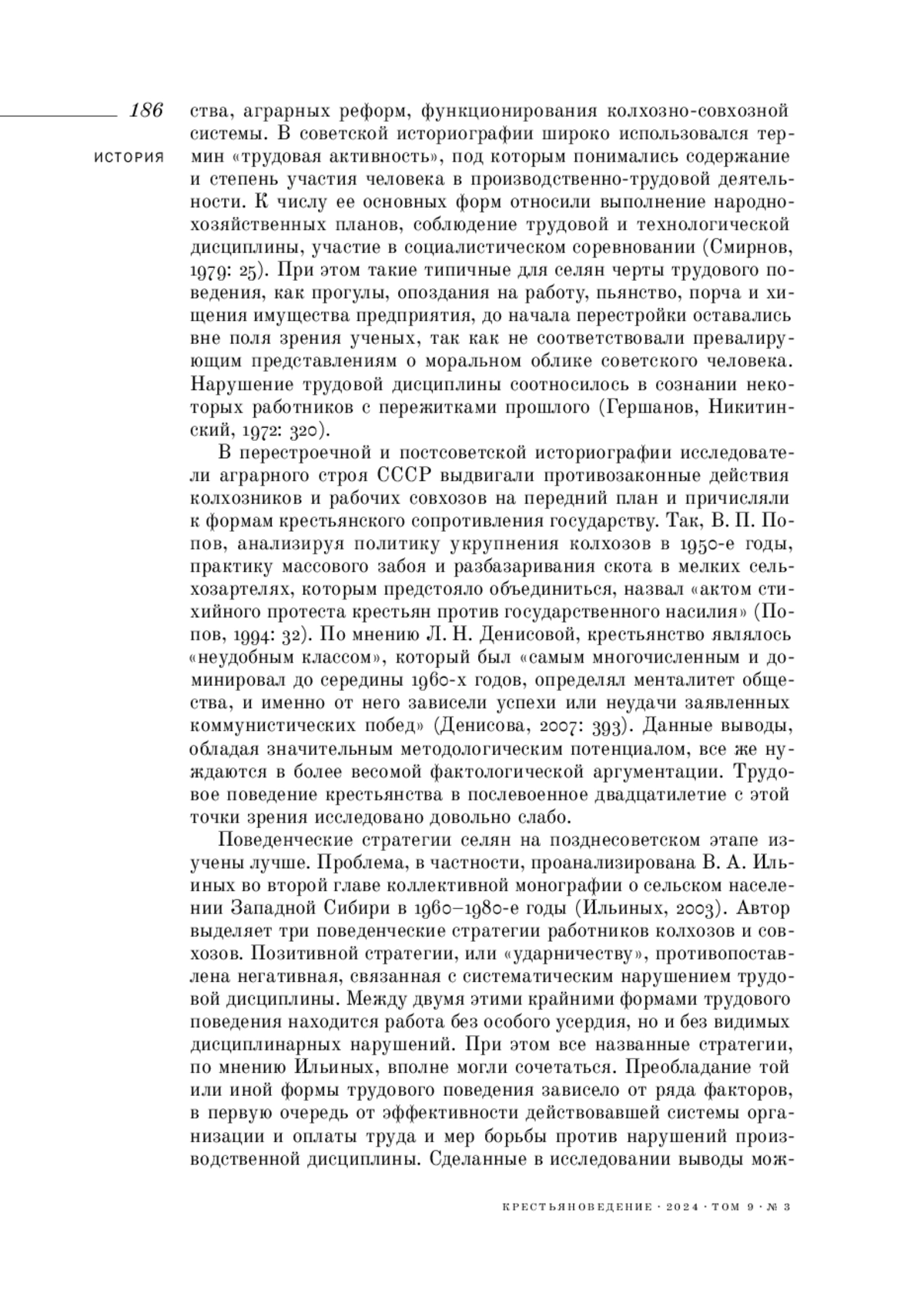 Необходимость изучения заявленной темы обусловлена ее весомой ролью в решении важнейших для понимания отечественной истории вопросов: особенностей модернизации сельского хозяйства, аграрных реформ, функционирования колхозно-совхозной системы. В советской историографии широко использовался термин «трудовая активность», под которым понимались содержание и степень участия человека в производственно-трудовой деятельности. К числу ее основных форм относили выполнение народнохозяйственных планов, соблюдение трудовой и технологической дисциплины, участие в социалистическом соревновании (Смирнов, 1979: 25). При этом такие типичные для селян черты трудового поведения, как прогулы, опоздания на работу, пьянство, порча и хищения имущества предприятия, до начала перестройки оставались вне поля зрения ученых, так как не соответствовали превалирующим представлениям о моральном облике советского человека. Нарушение трудовой дисциплины соотносилось в сознании некоторых работников с пережитками прошлого (Гершанов, Никитинский, 1972: 320).