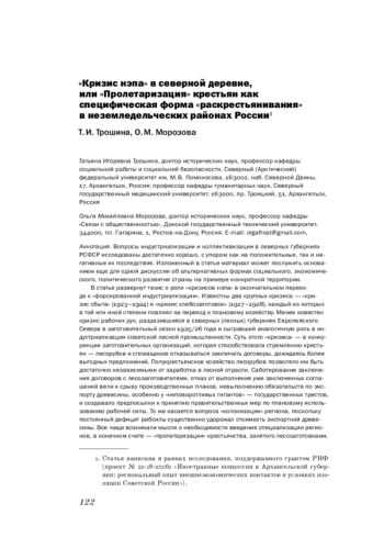 Вопросы индустриализации и коллективизации в северных губерниях РСФСР исследованы достаточно хорошо, с упором как на положительные, так и негативные их последствия. Изложенный в статье материал может послужить основанием еще для одной дискуссии об альтернативных формах социального, экономического, политического развития страны на примере конкретной территории. В статье развернут тезис о роли «кризисов нэпа» в окончательном переходе к «форсированной индустриализации». Известны два крупных кризиса - «кризис сбыта» (1923-1924) и «кризис хлебозаготовок» (1927-1928), каждый из которых в той или иной степени повлиял на переход к плановому хозяйству. Менее известен кризис рабочих рук, разразившийся в северных (лесных) губерниях Европейского Севера в заготовительный сезон 1925/26 года и сыгравший аналогичную роль в индустриализации советской лесной промышленности. Суть этого «кризиса» - в конкуренции заготовительных организаций, которая способствовала стремлению крестьян - лесорубов и сплавщиков отказываться заключать договоры, дожидаясь более выгодных предложений. Полукрестьянское хозяйство лесорубов позволяло им быть достаточно независимыми от заработка в лесной отрасли. Саботирование заключения договоров с лесозаготовителями, отказ от выполнения уже заключенных соглашений вели к срыву производственных планов, невыполнению обязательств по экспорту древесины, особенно у «неповоротливых гигантов» - государственных трестов, и создавало предпосылки к принятию правительственных мер по плановому использованию рабочей силы. То же касается вопроса «колонизации» региона, поскольку постоянный дефицит рабсилы существенно удорожал стоимость экспортной древесины. Все чаще возникали мысли о необходимости введения специализации регионов, в конечном счете - «пролетаризации» крестьянства, занятого лесозаготовками. Эти радикальные идеи на фоне реальных проблем стали овладевать умами и более рациональных хозяйственников. Негативные результаты полугосударственного хозяйствования на ресурсных территориях периода нэпа создали представление о пятилетних планах как наиболее перспективном и быстром способе их преодоления. Несмотря на сохранявшийся революционный энтузиазм с его идеями свободы, практики все чаще соглашались с предложениями предпринимателей XIX века о необходимости использовать здесь принудительный труд. Заселение лесных районов административно высланными крестьянами, а также твердые задания по лесозаготовкам для местного населения, включая колхозников, виделись единственным выходом из создавшегося кризиса, который рассматривается в статье как еще один «кризис нэпа». Для обоснования своих выводов авторами привлечен большой комплекс источников, в первую очередь архивных документов.