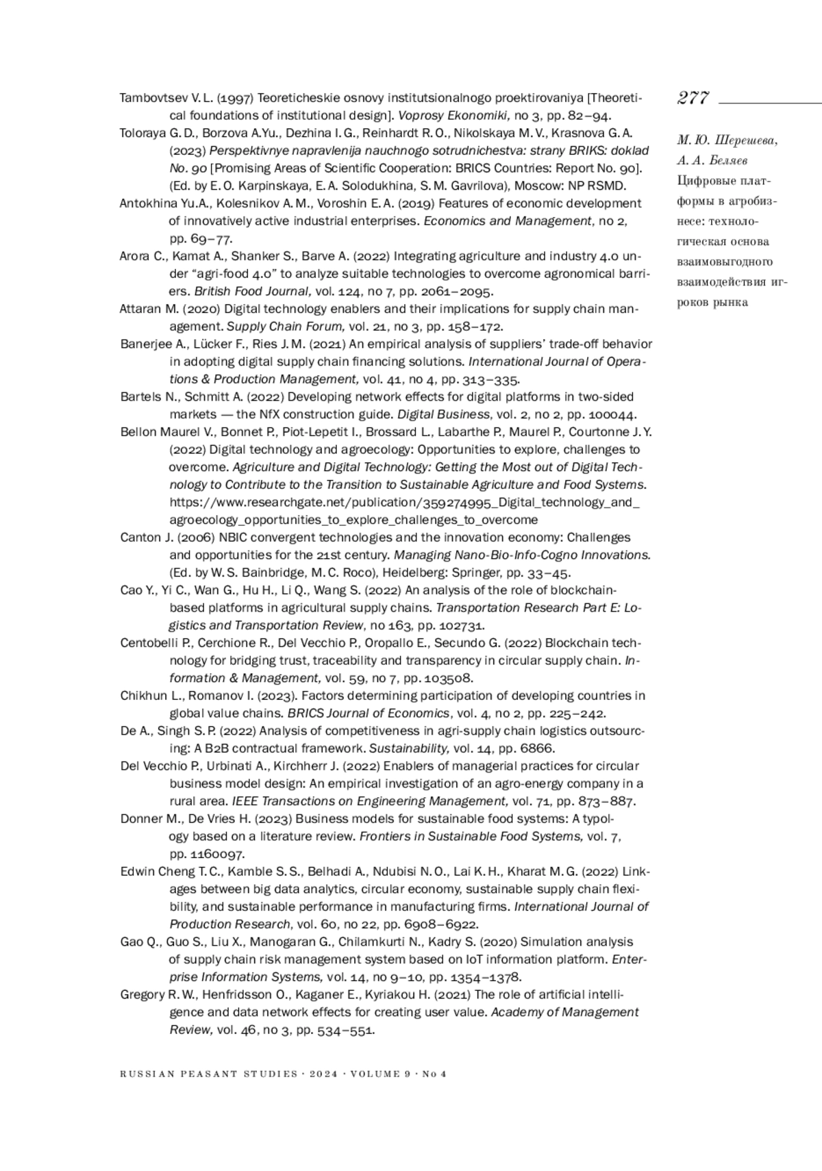 22. Cao Y., Yi C., Wan G., Hu H., Li Q., Wang S. (2022). An analysis on the role of blockchain-based platforms in agricultural supply chains // Transportation Research Part E: Logistics and Transportation Review. № 163. Р. 102731. EDN: CRRCJW