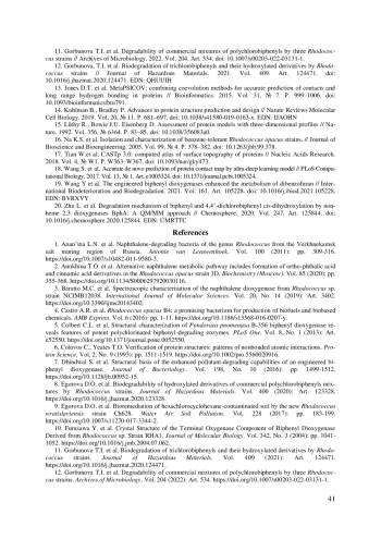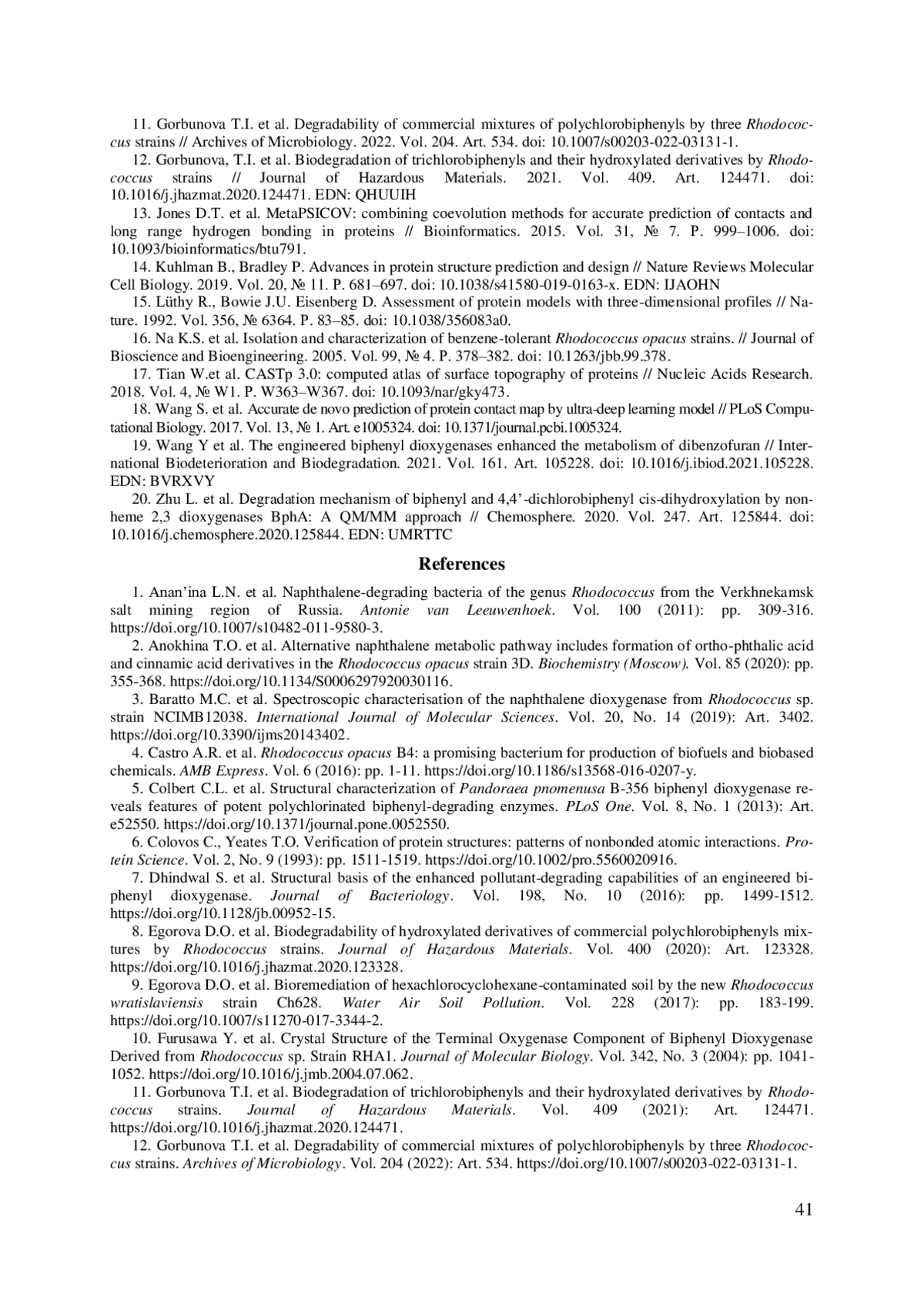 11. Gorbunova T.I. et al. Degradability of commercial mixtures of polychlorobiphenyls by three Rhodococcus strains // Archives of Microbiology. 2022. Vol. 204. Art. 534. DOI: 10.1007/s00203-022-03131-1 EDN: JJZKTB