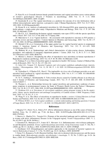 23. Kalia N., Singh J., Kaur M. Microbiota in vaginal health and pathogenesis of recurrent vulvovaginal infections: a critical review // Annals of Clinical Microbiology and Antimicrobials. 2020. Vol. 19, № 1. P. 1-19. DOI: 10.1186/s12941-020-0347-4 EDN: TUWXHA