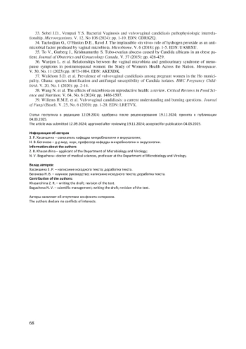 33. Sobel J.D., Vempati Y.S. Bacterial Vaginosis and vulvovaginal candidiasis pathophysiologic interrelationship // Microorganisms. 2024. Vol. 12, № 108. P. 1-10. DOI: 10.3390/microorganisms12010108 EDN: GDRKZQ