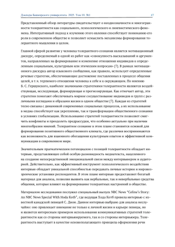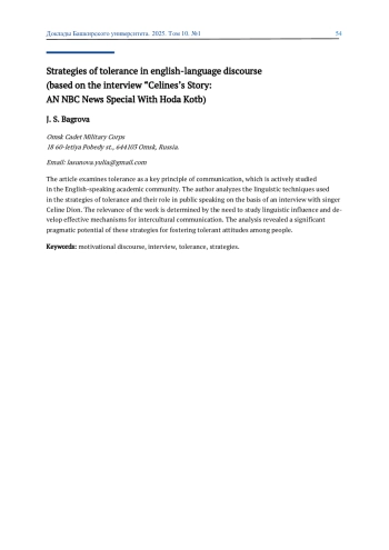 Статья посвящена толерантности как ключевому принципу коммуникации, исследуемому в англоязычном академическом сообществе. На основе интервью с певицей Селин Дион анализируются языковые приемы стратегий толерантности и их роль в публичных выступлениях. Актуальность работы обусловлена необходимостью изучения языкового воздействия и разработки эффективных механизмов межкультурного общения. Анализ показал значительный прагматический потенциал этих стратегий для формирования толерантного отношения между людьми.