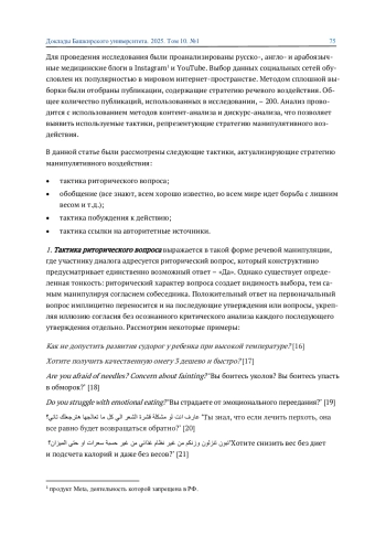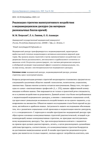 Медицинский дискурс трансформируется в медиамедицинский, характеризующийся высокой степенью медиатизации и активным вовлечением широкой аудитории. Мы провели анализ стратегий и тактик манипулятивного воздействия в медицинских блогах русскоязычного, англоязычного и арабоязычного сегментов социальных сетей. Результаты демонстрируют, что тактики риторических вопросов и обобщений усиливают персуазивный эффект и являются универсальными, что, на наш взгляд, связано с институциональностью медицинского дискурса.