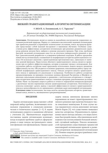 Для гравитационных алгоритмов поиска (GSA) исходным физическим механизмом служит образование плотных тел во вселенной за счёт гравитационного притяжения частиц [7]. Они обладают наглядностью и удобны для программной реализации. В них данным сопоставляют отдельные частицы в многомерном пространстве, испытывающие условное взаимное притяжение подобное притяжению масс, значение которых зависит от величины целевой функции. GSA дают возможность решать сложные задачи глобальной оптимизации [8–11] и нашли различные приложения [12–15]. Несмотря на существенное удобство применения GSA, им присущи определённые недостатки, связанные с использованием уравнений в виде законов Ньютона с консервативными силами. Уже в исходной физической формулировке они приводят к нежелательным эффектам потери точности за счёт инерции движения, так как перемещение частиц продолжается и после прекращения действия сил.