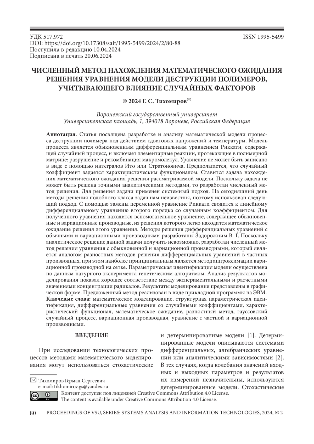 Осуществлена структурная и параметрическая идентификация модели процесса деструкции полимеров при термомеханических воздействиях. Решение модели осуществлено с использованием численного метода решения уравнения с обыкновенной и вариационной производными. Численные методы нахождения математического ожидания решения дифференциальных уравнений, которые записываются в форме Ито или Стратоновича, встречаются в литературе [10, 17, 18].