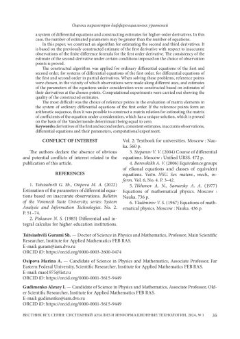 1. Цициашвили Г. Ш. Оценка параметров дифференциальных уравнений по неточным наблюдениям / Г. Ш. Цициашвили, М. А. Осипова // Вестник Воронежского ГУ серия: Системный анализ и информационные технологии. - 2022. - № 2. - С. 51-74.