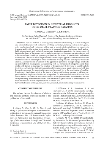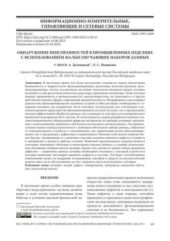 Статья: ОБНАРУЖЕНИЕ НЕИСПРАВНОСТЕЙ В ПРОМЫШЛЕННЫХ ИЗДЕЛИЯХ С ИСПОЛЬЗОВАНИЕМ МАЛЫХ ОБУЧАЮЩИХ НАБОРОВ ДАННЫХ (2024)