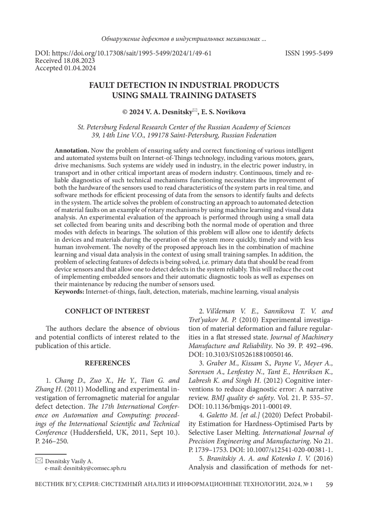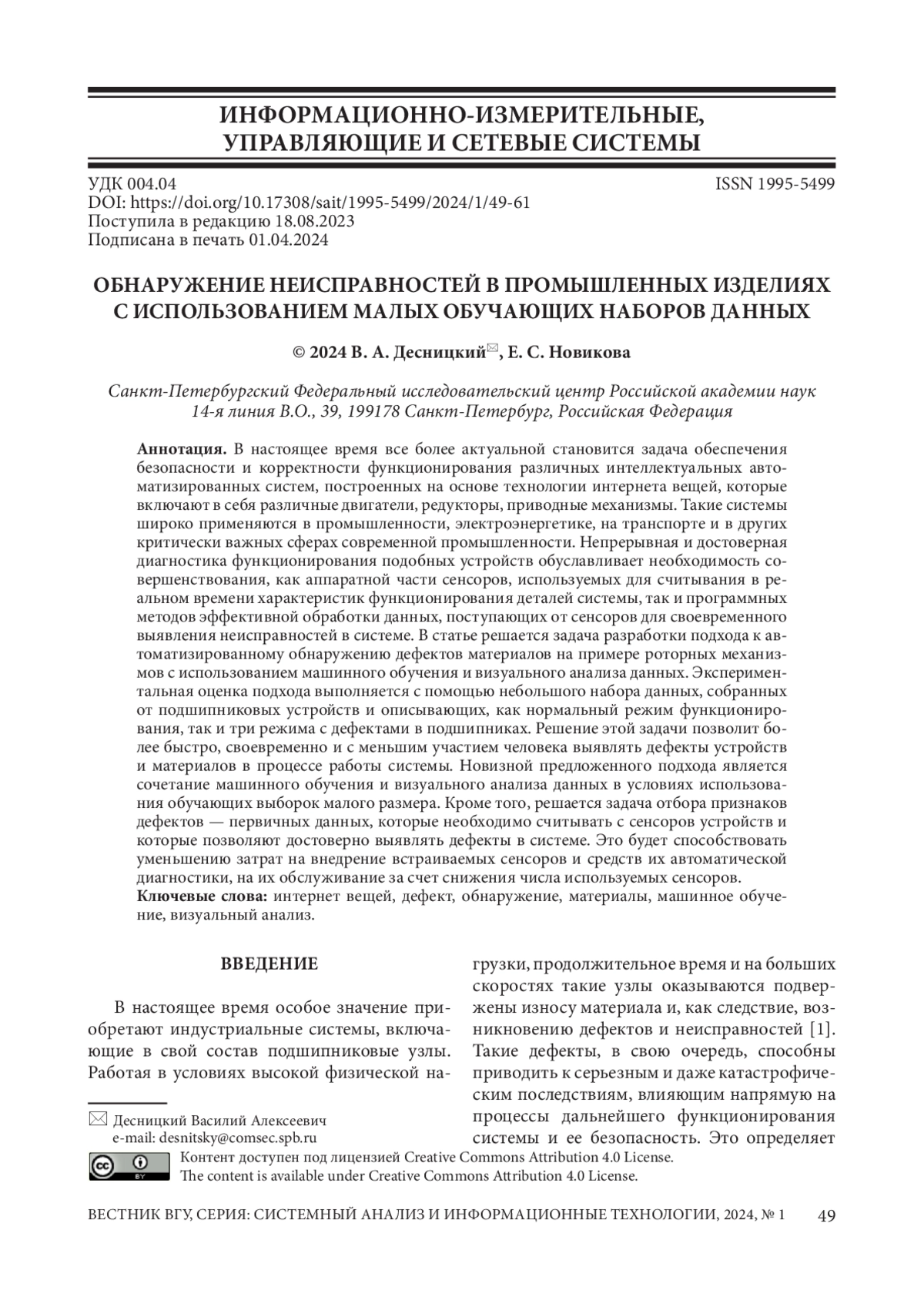 ДЕСНИЦКИЙ В. А., НОВИКОВА Е. С. ОБНАРУЖЕНИЕ НЕИСПРАВНОСТЕЙ В ПРОМЫШЛЕННЫХ ИЗДЕЛИЯХ С ИСПОЛЬЗОВАНИЕМ МАЛЫХ ОБУЧАЮЩИХ НАБОРОВ ДАННЫХ // ВЕСТНИК ВОРОНЕЖСКОГО ГОСУДАРСТВЕННОГО УНИВЕРСИТЕТА. СЕРИЯ: СИСТЕМНЫЙ АНАЛИЗ И ИНФОРМАЦИОННЫЕ ТЕХНОЛОГИИ. 2024. № 1