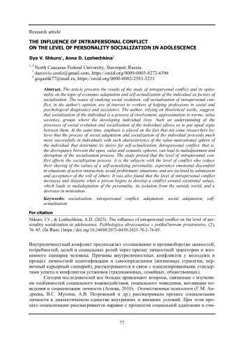 В статье представлены результаты исследования внутриличностного конфликта и его влияния на социальную адаптацию и самоактуализацию личности как факторов социализации. Вопросы изучения социальной адаптации, самоактуализации внутриличностного конфликта, по мнению автора, представляют интерес для работников помогающих профессий в социальной и психологической диагностике и помощи. Автор, опираясь на теоретические работы, предполагает, что социализация личности - это процесс приобщения, адаптации к нормам, ценностям общества, группы, где живет и развивается личность. Такое понимание процессов социальной адаптации и социализации личности позволяет поставить между ними знак равенства. При этом акцентируется внимание на том, что некоторые исследователи полагают, что процесс социальной адаптации и социализации личности протекает значительно успешнее у лиц с такими характеристиками ценностно-мотивационной сферы личности, которые определяют ее стремление к самоактуализации. Внутриличностный конфликт, то есть несовпадение целевой, ценностной и смысловой сфер, может привести к дезадаптации и нарушению процесса социализации. В результате исследования было доказано, что уровень проявления внутриличностного конфликта оказывает влияние на процесс социализации: именно испытуемые с высоким уровнем внутренней конфликтности меньше разделяют ценности самоактуализирующейся личности, испытывают эмоциональный дискомфорт в ситуации социального взаимодействия, избегают проблемных ситуаций, склонны к подчинению, принятию воли других. Также, было выявлено, что уровень внутриличностной конфликтности повышается и углубляется, когда у личности начинает разворачиваться конфликт вокруг экзистенциальных ценностей, что приводит к дезадаптации личности, ее закрытости от внешнего мира, снижению мотивации.
