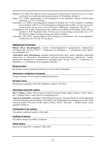 7. Лысогорская М.В. Внутриличностный ценностный конфликт как индикатор качества жизни личности // Проблемы социальной психологии личности / ред. Р.М. Шамионов. Выпуск 2. Саратов: Издательство Саратовского университета, 2005. С. 93-99.