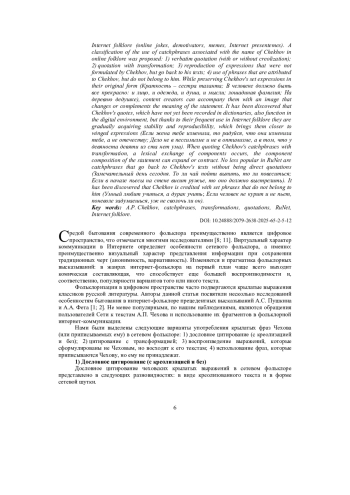 Исследование крылатых фраз А. П. Чехова (или приписываемых ему) в цифровой среде показало, что они востребованы и воспроизводимы в различных жанрах интернет-фольклора (сетевых анекдотах, демотиваторах, мемах, интернет-презентемах). Была предложена классификация употребления крылатизмов, связанных с именем Чехова, в сетевом фольклоре: 1) дословное цитирование (с креолизацией и без); 2) цитирование с трансформацией; 3) воспроизведение выражений, которые сформулированы не Чеховым, но восходят к его текстам; 4) использование фраз, которые приписываются Чехову, но ему не принадлежат. При сохранении чеховских устойчивых выражений в первозданном виде (Краткость - сестра таланта; В человеке должно быть все прекрасно: и лицо, и одежда, и душа, и мысли; лошадиная фамилия; На деревню дедушке) создатели контента могут сопровождать их изображением, изменяющим или дополняющим смысл высказывания. Обнаружено, что в цифровой среде также функционируют чеховские цитаты, до сих пор не зафиксированные в словарях, но благодаря частому использованию в интернет-фольклоре постепенно приобретающие устойчивость и воспроизводимость, что сближает их с крылатизмами (Если жена тебе изменила, то радуйся, что она изменила тебе, а не отечеству; Дело не в пессимизме и не в оптимизме, а в том, что у девяноста девяти из ста нет ума). При цитировании крылатых фраз Чехова с трансформацией происходит лексическая мена компонентов, может расширяться или сокращаться компонентный состав высказывания. Не меньшую востребованность в Рунете имеют крылатые выражения, которые восходят к текстам Чехова, не будучи прямыми цитатами (Замечательный день сегодня. То ли чай пойти выпить, то ли повеситься; Если в начале пьесы на стене висит ружье, то оно должно выстрелить). Обнаружено, что Чехову приписываются устойчивые фразы, не принадлежащие ему (Умный любит учиться, а дурак учить; Если человек не курит и не пьет, поневоле задумаешься, уж не сволочь ли он).