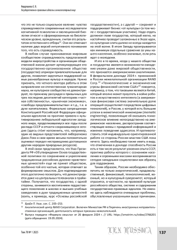 Построение многополярного мира требует от государства, претендующего на роль полюса, предложения конкурентоспособной модели общественного устройства и миропорядка, признаваемой как собственным населением, так и участниками международного общения. Эта модель должна опираться и отражать ту силу, которая позволяет государству претендовать на соответствующий статус, выигрышно отличает соответствующий «полюс» от прочих участников международного общения и способна обеспечить необходимое равновесие сложной системе международных отношений. В настоящее время в Российской Федерации указанная модель не артикулирована, хотя и обозначена политическим руководством страны. Имеющиеся трудности ее разработки обусловлены целым рядом причин. Одна из них — вопрос культурного суверенитета, другая — сложный самоорганизующийся характер системы общественных отношений. В статье обозначен ряд теоретико-правовых вопросов, на которые необходимо обратить внимание в процессе формирования соответствующей модели в современной России: язык юридической науки, государственно-правовые идеалы, включая понятие справедливости, и т. д. Подчеркивается также, что разработка модели должна осуществляться специалистами различных направлений научного знания с привлечением методологии постнеклассической науки, позволяющей рассматривать государственно-организованную систему общественных отношений и международный порядок как сложную саморазвивающуюся открытую систему.