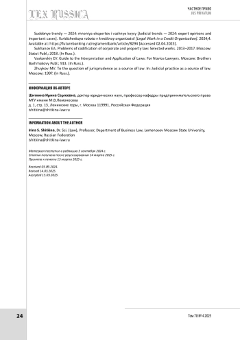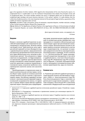 Автор рассматривает значение судебной практики в российском правопорядке. Притом что Россия относится к странам континентальной правовой семьи, источником права в которых признаются нормативные правовые акты, а прецедент в том смысле, который придается ему в странах общего права, не является источником права, судебную практику в форме правовых позиций высших судебных инстанций фактически следует считать квазиисточником российского права. Автор анализирует отдельные определения Верховного Суда РФ по корпоративным спорам, выявляя противоречие высказанных в них позиций законодательству или судебной практике. На примерах конкретных корпоративных споров автор рассматривает возможность и условия применения закона по аналогии: наличие пробела в регулировании сходных отношений. Применительно к толкованию судами нормы права подчеркивается недопустимость использования способа толкования, нарушающего принципы права, его основополагающие идеи. Автор задается вопросом, могут ли суды в отдельных судебных актах отклоняться от сложившихся правовых позиций, осуществлять оценку бизнес-решений. По мнению автора, совершенно очевидно, что единообразие судебной практики представляет собой важнейший элемент принципа правовой определенности, гарантию стабильности гражданского оборота.