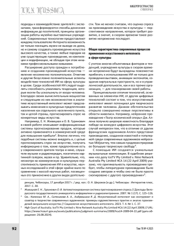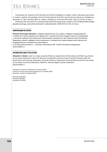 9. Калятин В. О. Определение субъекта прав на результаты интеллектуальной деятельности, созданные с использованием искусственного интеллекта // Право. Журнал Высшей школы экономики. 2022. № 4. С. 24-50.