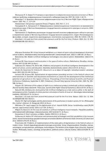 2. Бакуменко М. А. Современные технологии искусственного интеллекта и сфера культуры // МедиаVектор. 2022. № 3. С. 4-9.