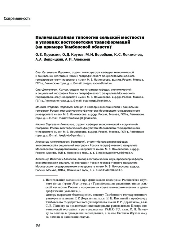 1. Аверкиева К. B. (2022). Внутрисельская миграция населения и локальные процессы трансформации сельской местности в лесной зоне староосвоенного Нечерноземья // Известия Российской академии наук. Серия географическая. № 6. С. 828-841.