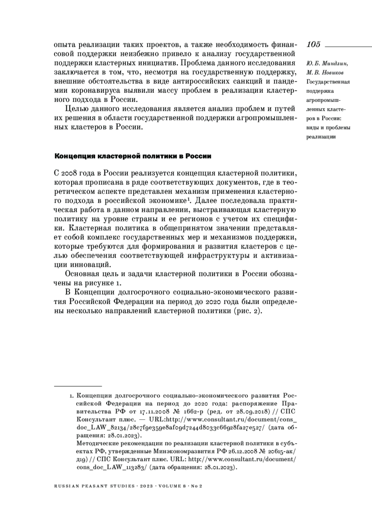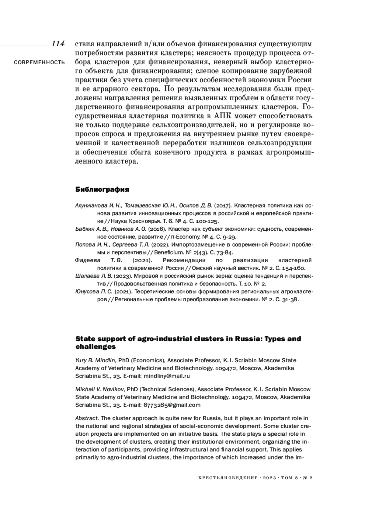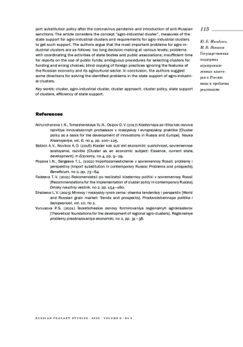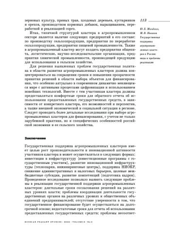 The cluster approach is quite new for Russia, but it plays an important role in the national and regional strategies of social-economic development. Some cluster creation projects are implemented on an initiative basis. The state plays a special role in the development of clusters, creating their institutional environment, organizing the interaction of participants, providing infrastructural and financial support. This applies primarily to agro-industrial clusters, the importance of which increased under the import substitution policy after the coronavirus pandemic and introduction of anti-Russian sanctions. The article considers the concept “agro-industrial cluster”, measures of the state support for agro-industrial clusters and requirements for agro-industrial clusters to get such support. The authors argue that the most important problems for agro-industrial clusters are as follows: too long decision-making at various levels; problems with coordinating the activities of state bodies and public associations; insufficient time for reports on the use of public funds; ambiguous procedures for selecting clusters for funding and wrong choices; blind copying of foreign practices ignoring the features of the Russian economy and its agricultural sector. In conclusion, the authors suggest some directions for solving the identified problems in the state support of agro-industrial clusters.