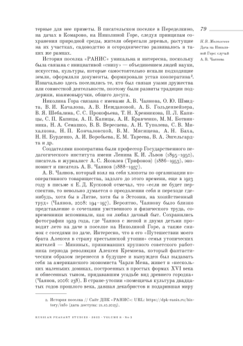 В статье рассматриваются особенности создания и деятельности дачно-потребительского поселка «Работников науки и искусства» («РАНИС») на Николиной Горе. Создававшийся как поселок-коммуна, он объединил творческую интеллигенцию 1920-1930-х годов, зачастую связанную дружескими или служебными отношениями. Здесь были реализованы принципы коллективизма: организация общественных огородов, выделение помещений для мелкого скотоводства, наличие общественного транспорта, создание кооперативной столовой и детских обучающих и досуговых мероприятий. Выступления артистов, музыкантов, писателей и ученых должны были объединять жителей поселка, формировать общие культурные представления. Мероприятия, проводимые здесь, стали своеобразным продолжением традиций литературы и искусства звенигородских мест, где бывали А. С. Пушкин, А. И. Герцен, А. П. Чехов, А. М. Горький, И. И. Левитан, К. С. Станиславский и др. Особое внимание в статье уделяется деятельности А. В. Чаянова, одного из трех создателей и вдохновителей дачного кооператива, привлекшего О. Ю. Шмидта, А. И. Кравченко, Б. А. Криля и др. на Николину Гору. Его раскопки в 1928-1929 годах Успенского городища на территории поселка носили не только научный (им предложена новая методика раскопок), но и образовательный характер, поскольку, кроме практических навыков, местные подростки получали и теоретические представления об истории земли, на которой были построены дачи. Феномен дачного кооператива на Николиной Горе является трансформацией усадебной традиции в реалиях XX века, где жизнь человека на лоне природы гармонично сочетается с интеллектуальной и творческой деятельностью.