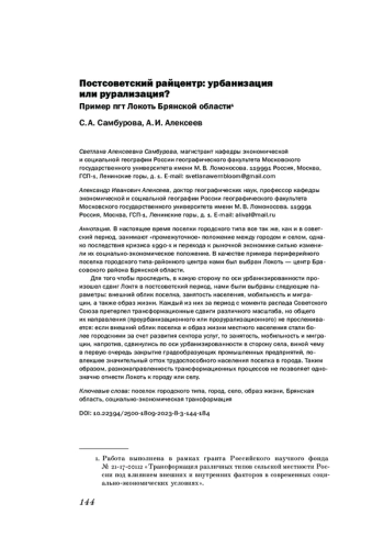 В настоящее время поселки городского типа все так же, как и в советский период, занимают «промежуточное» положение между городом и селом, однако последствия кризиса 1990-х и перехода к рыночной экономике сильно изменили их социально-экономическое положение. В качестве примера периферийного поселка городского типа-районного центра нами был выбран Локоть - центр Брасовского района Брянской области. Для того чтобы проследить, в какую сторону по оси урбанизированности произошел сдвиг Локтя в постсоветский период, нами были выбраны следующие параметры: внешний облик поселка, занятость населения, мобильность и миграции, а также образ жизни. Каждый из них за период с момента распада Советского Союза претерпел трансформационные сдвиги различного масштаба, но общего их направления (проурбанизационного или прорурализационного) не прослеживается: если внешний облик поселка и образ жизни местного населения стали более городскими за счет развития сектора услуг, то занятость, мобильность и миграции, напротив, сдвинулись по оси урбанизированности в сторону села, виной чему в первую очередь закрытие градообразующих промышленных предприятий, повлекшее значительный отток трудоспособного населения поселка в города. Таким образом, разнонаправленность трансформационных процессов не позволяет однозначно отнести Локоть к городу или селу.