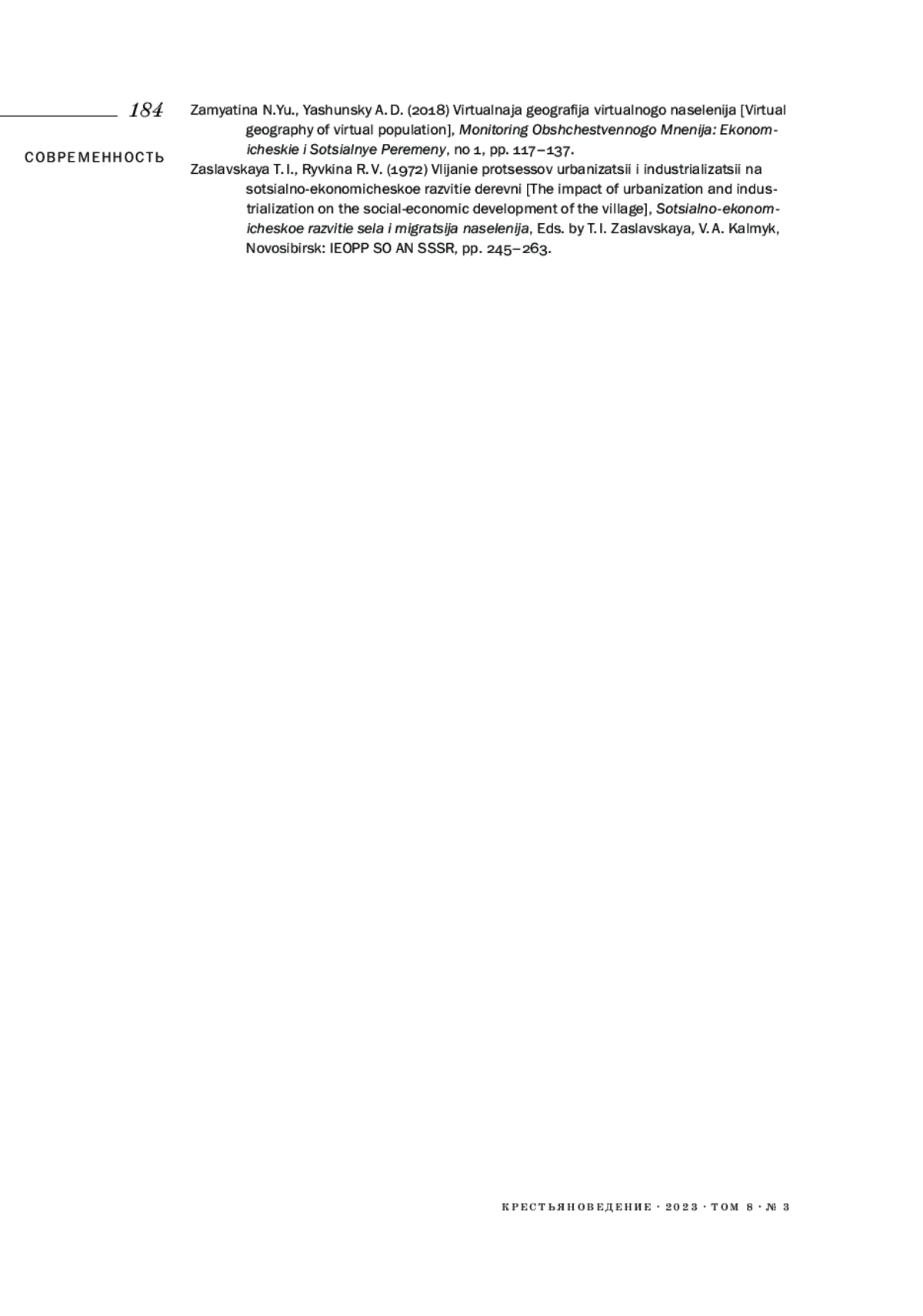 8. Заславская Т. И., Рывкина Р. В. (1972). Влияние процессов урбанизации и индустриализации на социально-экономическое развитие деревни // Социально-экономическое развитие села и миграция населения: сборник статей / Т. И. Заславская, В. А. Калмык (ред.). Новосибирск: ИЭиОПП СО АН СССР. С. 245-263.