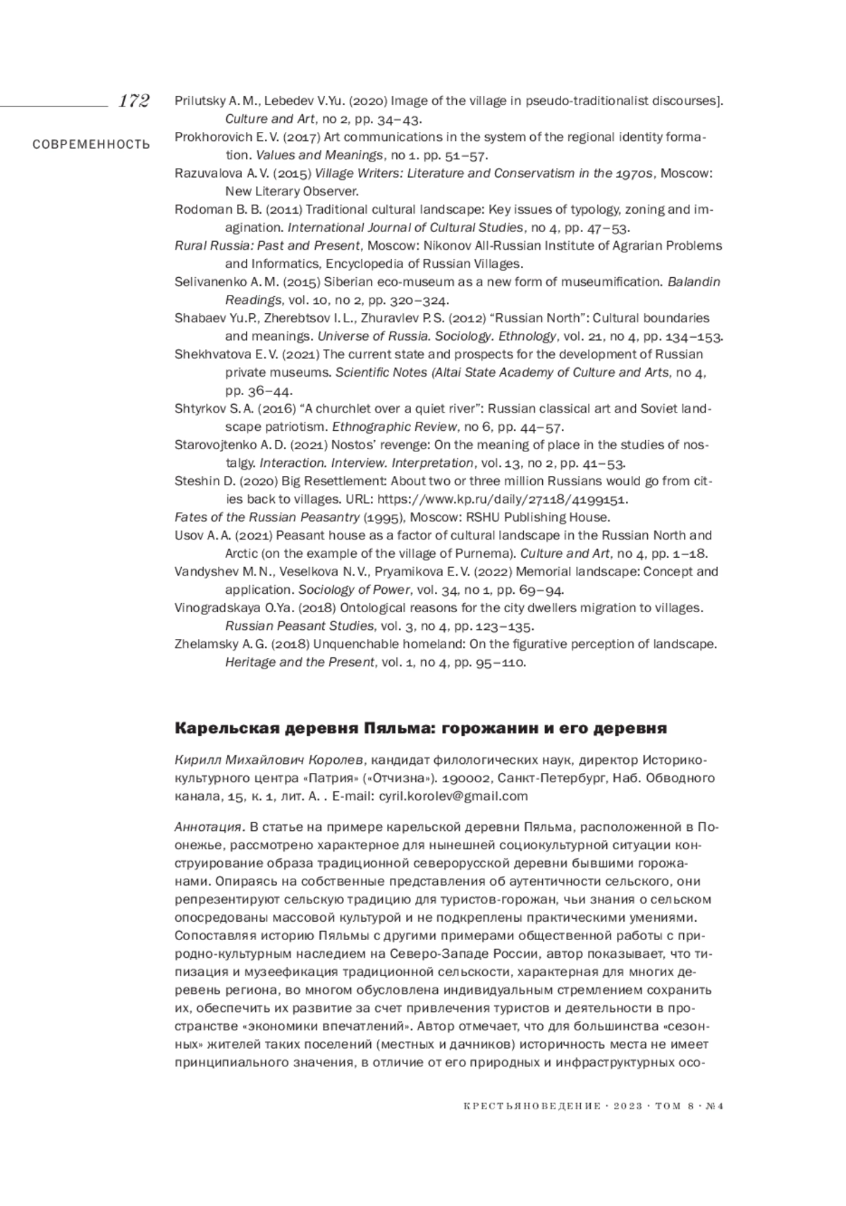 25. Kupriyanov P. S., Savina N. A. (2020) Contemporary museum of the Russian village: Production of rural life by former city dwellers]. Ethnographic Review, no 6, pp. 12-30. EDN: YOCUUU