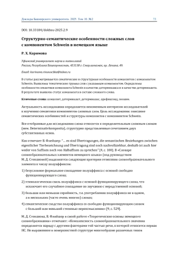 В статье рассматриваются сематические и структурные особенности композитов с компонентом Schwein. Выявлены тематические группы слов с указанным компонентом. Определены особенности семантики компонента Schwein в качестве детерминанса и в качестве детерминанта. В результате выявлен статус компонента в составе сложного слова.