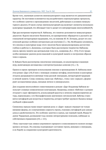 Творчество Владимира Набокова занимает уникальное место в мировой литературе, и оно привлекает внимание исследователей благодаря синтезу языковой игры, культурных аллюзий и богатства лексических средств [1]. Лингвокультурный код его произведений представляет собой сложный сплав литературных, национальных и языковых пластов, который служит ключом к интерпретации авторского замысла.