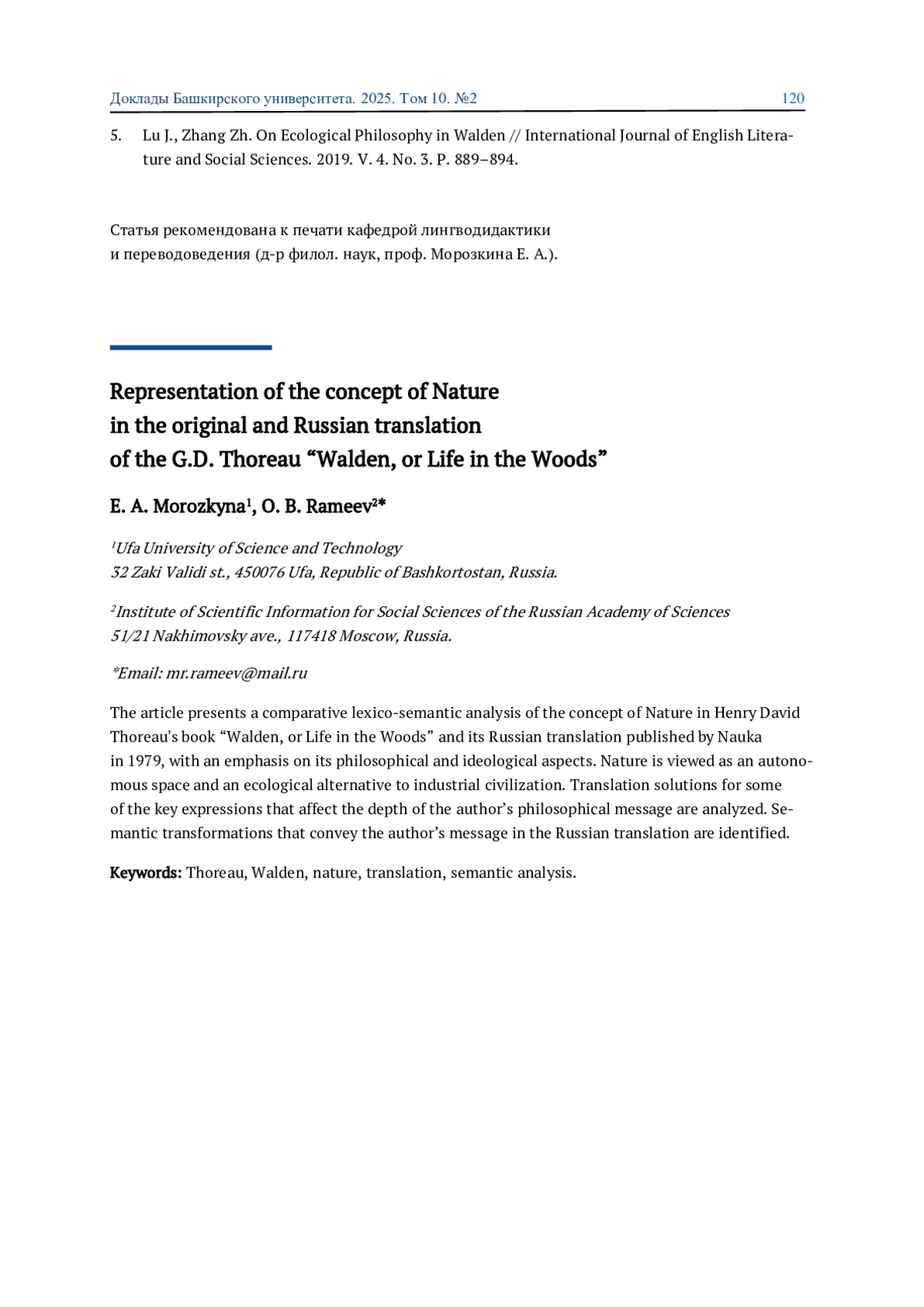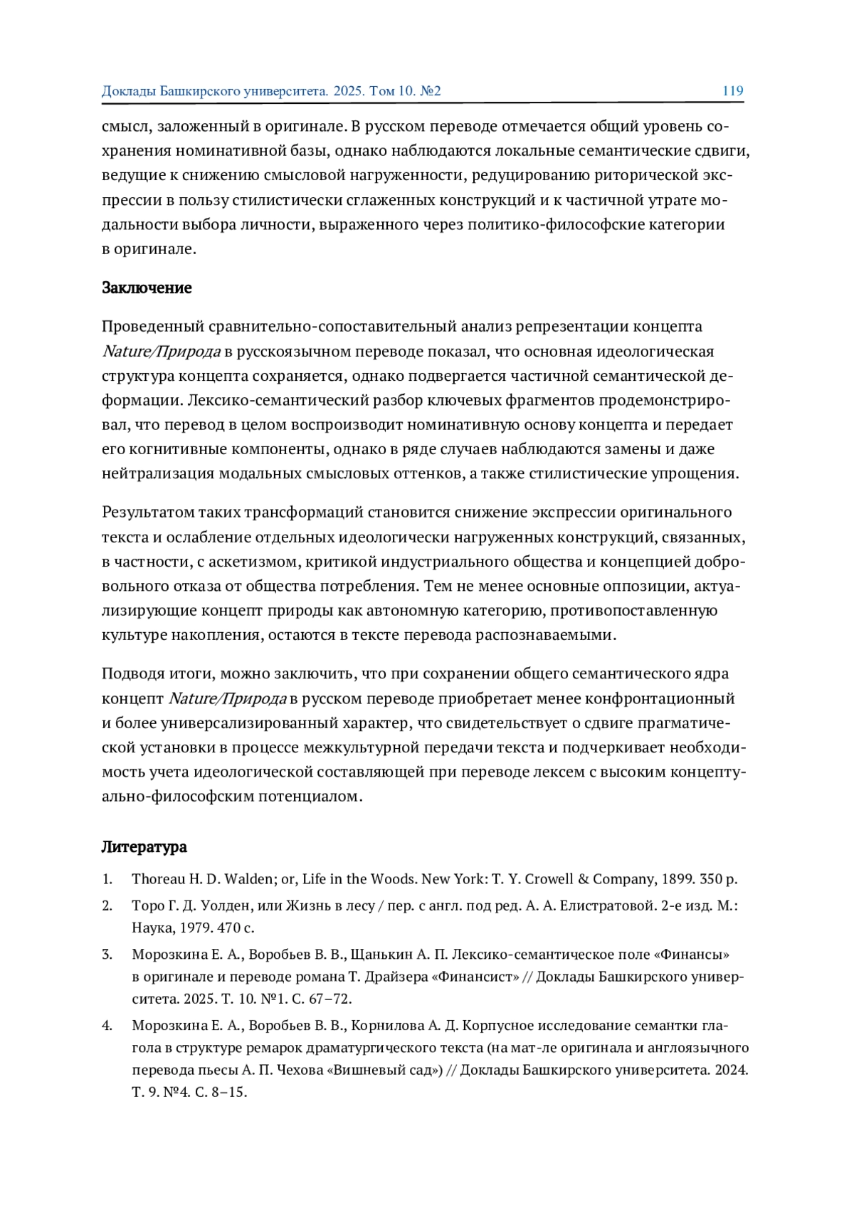 МОРОЗКИНА Е. А., РАМЕЕВ О. Б. РЕПРЕЗЕНТАЦИЯ КОНЦЕПТА NATURE/ПРИРОДА В ОРИГИНАЛЕ И РУССКОЯЗЫЧНОМ ПЕРЕВОДЕ ТРАКТАТА Г. Д. ТОРО «УОЛДЕН, ИЛИ ЖИЗНЬ В ЛЕСУ» // ДОКЛАДЫ БАШКИРСКОГО УНИВЕРСИТЕТА. 2025. Т. 10 № 2