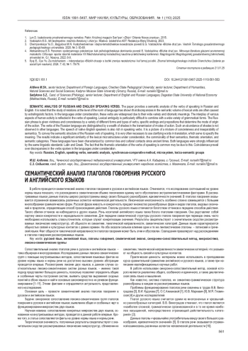 В работе проводится семантический анализ глаголов говорения в русском и английском языках. Отмечается, что исследование соотношений на уровне нормы языка показало, что расхождения в семантическом объеме лексических единиц часто обусловлено экстралингвистическими факторами. В рассматриваемых языках данные глаголы широко распространены ввиду своего большого разнообразия, идиоматичности значений. В глаголах говорения оказывается отраженной взаимосвязь различных аспектов человеческой деятельности. Лексическая многозначность особенно сложно совмещается с большим многообразием грамматических форм. Русской фразе живость и конкретность придают множество разнообразных форм и видов глаголов, видовых окончаний и предлогов, определяющие способ происхождения действия. Глаголы русского языка отличаются богатством оттенков в передаче способов действия. Такого обилия оттенков не наблюдается в других языках. Речь носителей английского языка также богата глаголами говорения. Она редставляет собой картину смеси конкретности и нераздельности семантики. Для передачи семантической структуры русского глагола говорения при переводе очень часто необходимо использовать слова-уточнители, которые служат конкретизации значения. Результаты свидетельствуют о значительном сходстве рассматриваемых лексических микроструктур, об общности их семантики, тематической направленности, семантических категорий. Данные языки характеризуются общностью связей и культурных контактов с давних времен. На оба оказали сильное влияние одни и те же лингвистические эталоны - латинский и греческий языки. Факт общности тематической направленности глаголов говорения может быть этим и обусловлен. Совпадения превалируют над расхождениями в глаголах говорения рассматриваемых языков.