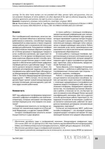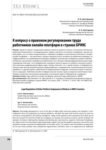 Одной из примет сегодняшнего времени является развитие техники и технологий. Всё больше работников вовлекаются в «нетрадиционные» формы занятости на интернет-платформах, причем как сама работа, так и ее поиск осуществляются с помощью платформ и искусственного интеллекта. Сегодня онлайн-платформы — это экосистемы, которые позволяют учесть интересы как работника (например, по подбору работы), так и работодателя (например, подобрать качественного сотрудника и развить собственный бизнес, организовать переобучение работников и пр.). Эксперты Международной организации труда справедливо отмечают, что платформенная экономика является одним из наиболее значимых изменений, вызванных цифровизацией сферы труда. Авторы отмечают, что, с одной стороны, платформенная занятость дает больше возможностей для трудоустройства и, следовательно, получения дополнительного заработка, а с другой стороны, работникам не предоставляются трудовые, пенсионные права и гарантии, они не защищены. Работники онлайн-платформ зачастую лишены права на ведение коллективных переговоров, заключение коллективных договоров и соглашений, права на объединение в профсоюз.