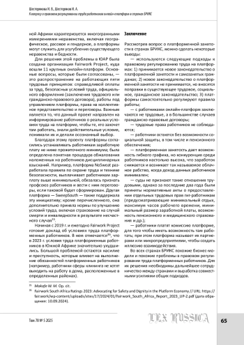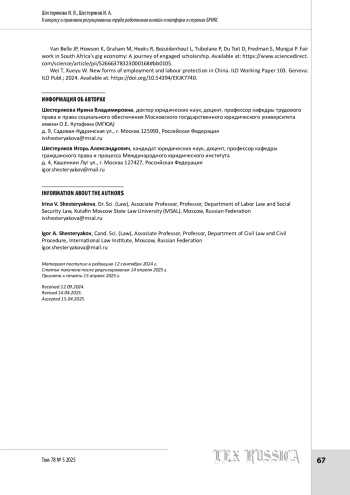 4. Mokofe W. M. Achieving decent work for digital platform workers in South Africa // Obiter. 2022. Vol. 43. No. 2. URL: https://scielo.org.za/scielo.php?script=sci_arttext&pid=S1682-58532022000200008#:~:text=In South Africa, it has,cent of those in employment https://scielo.org.za/scielo.php?script=sci_arttext&pid=S1682-58532022000200008.