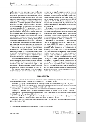 Автор формирует научно обоснованные выводы о направлениях развития судебной практики по вопросам применения недавно появившихся в ГК РФ норм, связанных с использованием цифровых технологий субъектами экономического оборота. В статье делается принципиальное заключение о том, что суды нередко используют рассматриваемые нормы не в том контексте, который имелся в виду при их создании. Практика по данным делам не может считаться сформированной, что, помимо прочего, подразумевает необходимость подготовки научно обоснованных разъяснений на уровне Верховного Суда РФ. Среди наиболее сложных остается вопрос о возможности применения ст. 141.1 ГК РФ по аналогии для регулирования отношений по поводу цифровых активов, прямо в законе не указанных. Рассуждая об электронном способе заключения договора, сто́ит сделать вывод о том, что статья 160 ГК РФ говорит о допустимости процедуры доказывания факта заключения договора и его условий, а не о субъективных гражданских правах участников экономического оборота на использование электронных средств коммуникации. Складывается точка зрения о существовании опровержимой презумпции того, что стороной сделки, заключенной посредством электронной идентификации, является тот субъект, который указан в документах о сделке.
