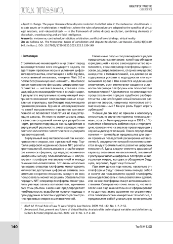 В статье рассматриваются юрисдикционные аспекты разрешения споров, возникающих в метавселенной — цифровом мире, ключевые особенности которого включают в себя: использование иммерсивных технологий (виртуальная реальность); представление пользователей через аватары; проведение транзакций с помощью блокчейна; существование централизованных и децентрализованных платформ; наличие в коммерческом обороте нематериализованных активов и NFT. Автор приводит классификацию споров, которые могут возникнуть в метавселенной: споры между пользователями и операторами платформ; споры между пользователями; споры по поводу интеллектуальной собственности. В первой категории автор особенно выделяет правовые конфликты, касающиеся виртуальной недвижимости, а также споры по поводу персональных данных пользователей платформ, операторы которых не могут гарантировать защиту от хакерских атак. Касательно споров между пользователями автор отмечает, что многие из них связаны с отсутствием в метавселенной какого-либо контроля за оказанием виртуальных услуг, созданием цифровых активов и совершением транзакций. Обращаясь к вопросу о применимом праве и подсудности, автор указывает, что в большинстве случаев соответствующие положения включаются в пользовательские соглашения отдельных платформ и не подлежат изменению. В статье рассмотрены три инструмента разрешения споров, возникающих в метавселенной: «традиционный» — в государственных судах или в рамках арбитража; «модифицированный», где правила судопроизводства адаптируются к специфике виртуальных правоотношений, и «децентрализованный» — в рамках онлайн-урегулирования споров, сочетающий в себе элементы блокчейна, краудсорсинга и искусственного интеллекта.
